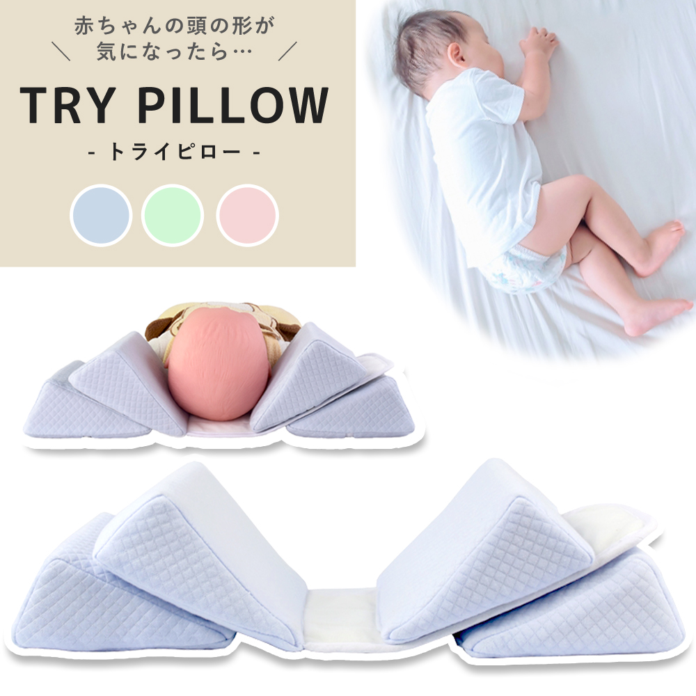 トライピローは、古くからあるベビー用のドーナツ型枕とは異なり、保護者の管理のもと、頭や身体の向きを左右どちらかに無理なく変えることのできる枕です。